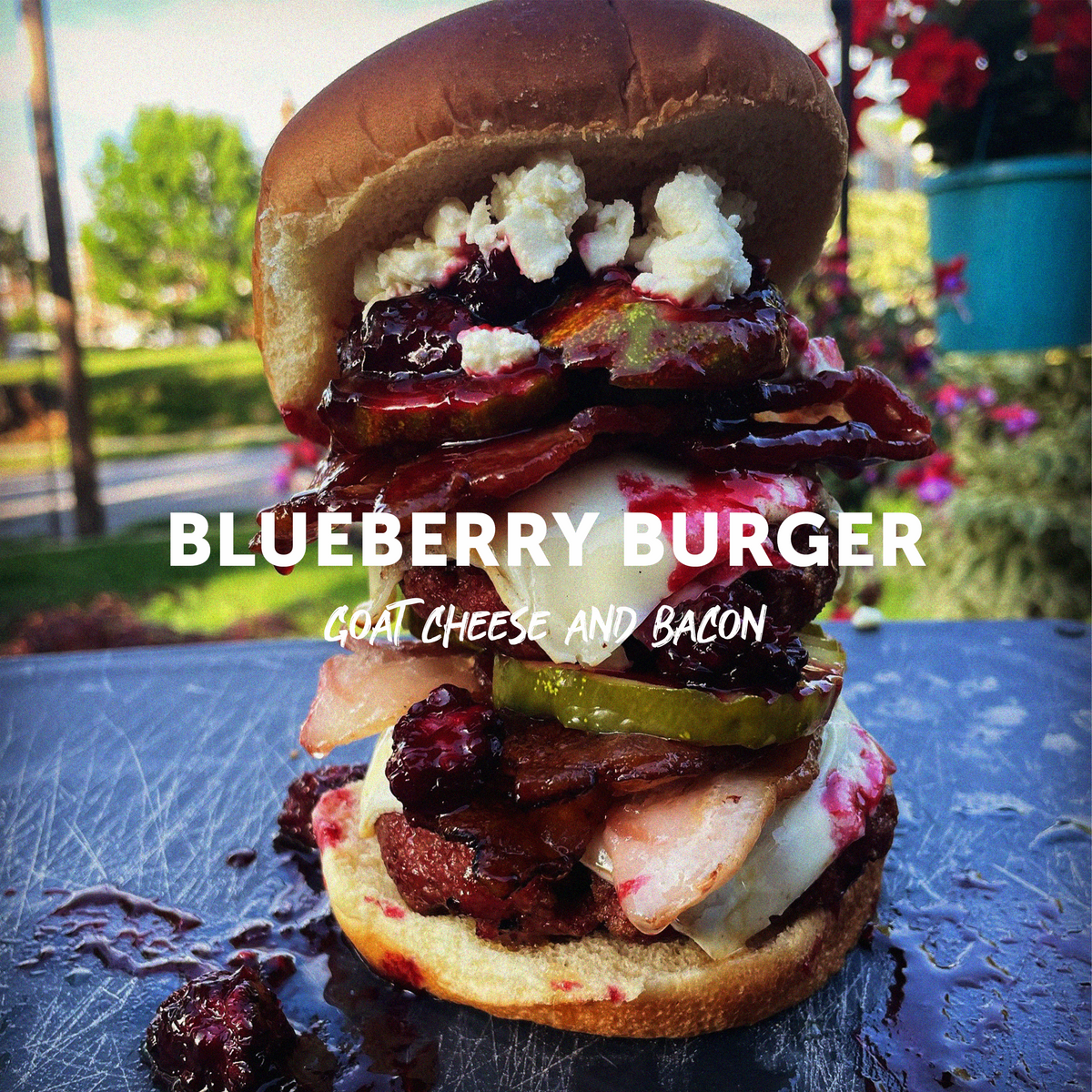 On the bottom bun, place a burger patty, two slices of bacon, and four dill pickle slices. Drizzle with the berry purée and sprinkle a handful of goat cheese on top. Finish with the top bun and enjoy!