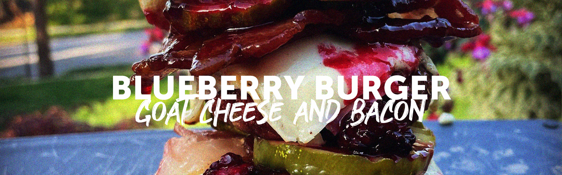 Stack another patty on top, add two more slices of bacon, 2 more pickles, extra berry purée, more goat cheese, and cap with the top bun.